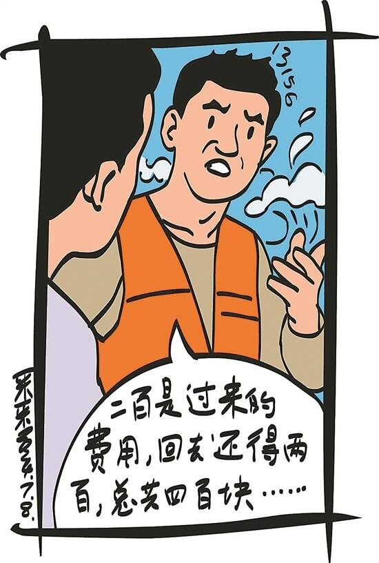 这时,男子提出要小方先把钱付了,小方心想钱迟早是要给的,于是掏出钱包,拿出仅有的200元现金递给了男子。男子却拉下脸说:“200元是过来的费用,回去还得200元,总共400元!”