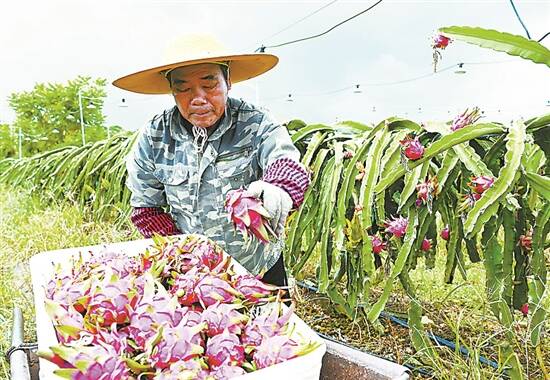 羊城晚报讯 记者戴灵敏,通讯员李柳枝、徐欣瑶报道:近日,广东农垦红十月农场有限公司(以下简称“红十月农场”)的742亩火龙果基地,迎来今年第7批火龙果成熟采摘。当天上午,记者来到采摘现场,与摘果工人们一道感受丰收的喜悦。
