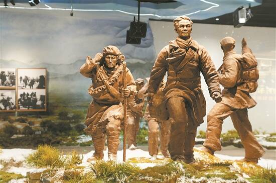 青海原子城纪念馆内雕塑再现了建设者们奔赴草原的情景