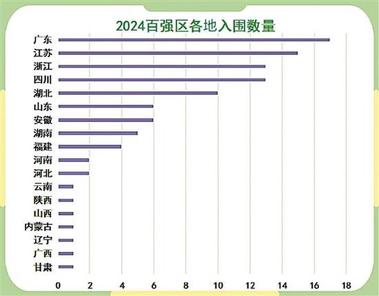 空间格局方面,“东强西弱,南强北弱”的不平衡分布格局持续缓解,中部城区表现亮眼。记者统计发现,东部百强区占据了57个席位,比例超过了二分之一,但呈逐年减少之势;中部百强区数量连续三年快速增长,增至24个;南方经济强区实力仍十分突出,共有84个城区榜上有名,北方城区则快速发力,百强区个数较2023年新增2个。