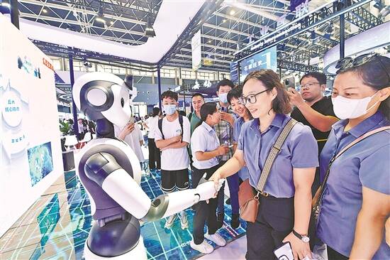 参观者在数博会上与人形机器人握手 新华社发