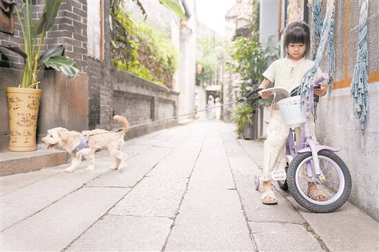 8月14日,广州番禺沙湾古镇石板巷子里,遛狗的小女孩忙里偷闲地读书