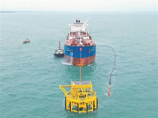 17日上午,“天鹰座”轮在徐闻海事处“海巡0927”船的护航下,进港航行至乌石终端原油外输单点水域,并安全顺畅系泊在单点装置上。17日下午,原油通过管道进入“天鹰座”轮油舱,乌石23-5油田首次原油外输作业正式开始。
