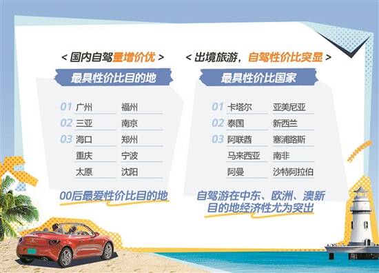 租租车发布的《2024暑期全球自驾游报告》显示,国内方面,自驾游多次出行同比增长700%,自驾旅行呈现高频化、周末化,出行时长同比增长6%,达3.2天,十大国内热门自驾城市包括:成都、乌鲁木齐、广州、三亚、海口、深圳、杭州、北京、昆明、上海。值得一提的是,广州成为国内性价比最高的自驾游目的地。