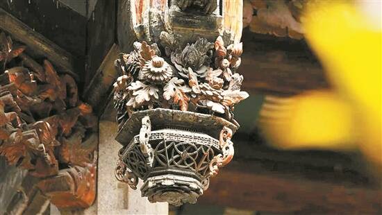 此外,祠堂门楼正门两边的柿花鸡心线四棱檐柱上,共有四角十二条凸线和八条凹线,且里外打磨得光滑如镜。柱上横梁悬有一对剔透玲珑、刻工细腻的倒挂石花篮,还被《中国美术全集》收录,并誉其“堪称中国一绝”。