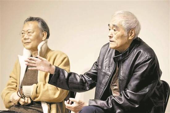 张广天(左)与芒克共同推出诗剧《太阳神光芒的电台》
