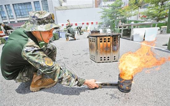 “障碍排除,开始!”指令接连下达。只见队员们忙而不乱,对自己的野战灶台炉头、油管进行检查、疏通、打气、点火,很快,一个个炉头吐出滚滚烈焰。