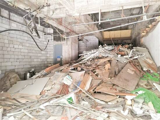 在地下车库入口的南侧,有一处门完全封闭,中午时分,记者看到有货车停在此处运装修材料进来,内部有人戴着安全头盔正在干活。在天字广场商住楼东边一楼的一个很大的房间内,有大量钢筋、钢架等废弃物资,几名搬运工正把房间里的大堆钢铁废品往货车上装。一名货车司机透露:“老板要把这些拆卸下来的废品清理卖出去,要大装修一番,开一间很大的海鲜酒家。”