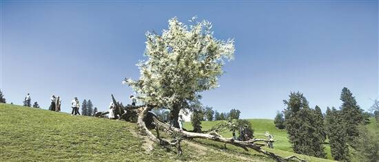 车队纵穿草原来到了“游牧人家”景点。这里既是草原的边缘,也是那拉提山的山脚。山顶白雪皑皑,在阳光照射下金光闪闪。山谷里到处长满了大片雪岭云杉,云杉是伊犁州的州树。这些树根深蒂固、枝繁叶茂,一般都高达20米至30米,树龄大都上百年,有的高达300多年。它们对于天山的水土保持起着至关重要的作用。