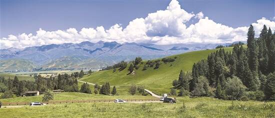 车辆缓缓爬坡前行,我们到了“天界山”景点。这是那拉提河谷草原和空中草原的分水岭。