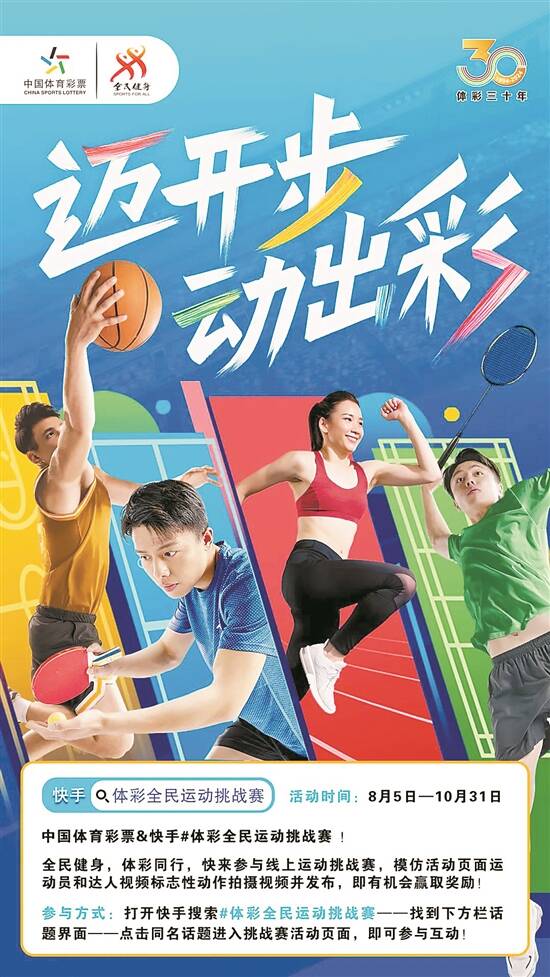 想要试一试身手的读者注意了,参与活动的方式如下:打开快手App,搜索#体彩全民运动挑战赛,找到下方栏话题界面,点击同名话题进入挑战赛页面,模仿运动员和达人的标志性动作,拍摄并发布短视频;或者自己创作运动视频,展现积极向上的快乐运动方式,添加指定话题#迈开步动出彩、#体彩全民快乐运动挑战赛,并@中国体育彩票,即可参与活动,并有机会赢取精美礼品。 (文/图 胡彦 粤体彩)