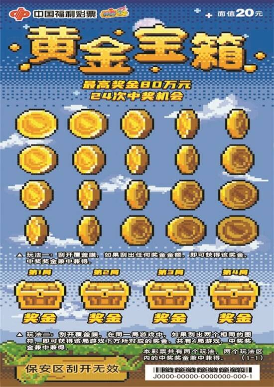 “黄金宝箱”单张面值20元,最高奖金80万元,单票多达24次中奖机会。“黄金宝箱”共有两个玩法,两个玩法区内的中奖奖金兼中兼得。玩法一:刮开覆盖膜,如果刮出任何奖金金额,即可获得该奖金,中奖奖金兼中兼得。玩法二:刮开覆盖膜,在同一局游戏中,如果刮出两个相同的图符,即可获得该局游戏下方所对应的奖金。共有4局游戏,中奖奖金兼中兼得。
