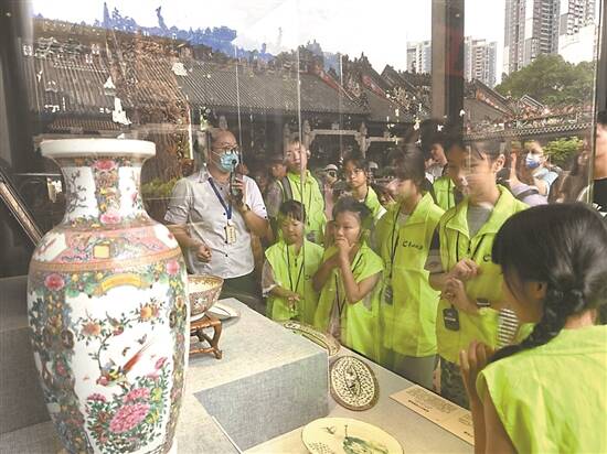 建筑以外,作为广东民间工艺博物馆,陈家祠的藏品也彰显着独具特色的岭南风格。惠来贝缀——以贝壳作为原材料创作而成的画,吸引了大家的目光。讲解员提问:“除了贝壳,大家再看这幅画的松针是用什么做的?”“海胆!”很快有学生记者做出正确回答。正是身处海边的地理位置,孕育出了这一特别的民间工艺。