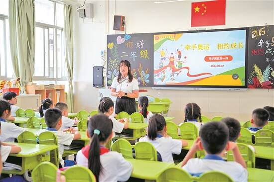 在小北路小学,巴黎奥运会跆拳道49公斤级亚军郭清“空降”现场,分享自身经历,鼓励孩子们遇到困难时“永远要坚持下去”;广州市培文外国语学校则在校长樊瑞的带领下用火炬传递的形式开启新学期大幕,让阳光奋进的精神洒满校园。