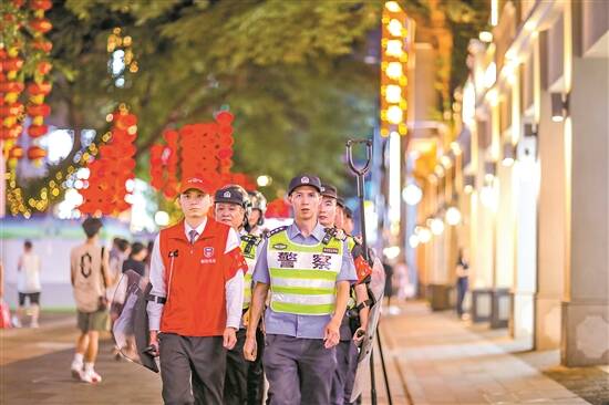 7月6日晚,越秀区北京路步行街,警灯闪烁、警徽庄严。聚焦商圈、广场等夜间人员密集场所,广州公安开展高密度巡逻防控,做到见警察、见警车、见警灯,为群众吹响“平安哨”,当好“守夜人”。