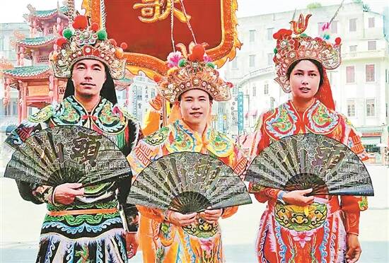 广东潮剧院一团青年演员、中国戏曲学院本科班学生吴嘉琳和蔡锦浩现场表演曾登上央视春晚的节目《苏六娘》选段,吸引谢思埸化身“小迷弟”,现场当起“梨园子弟”,穿戏服、学潮剧,在一招一式中领略传统非遗项目的艺术魅力。