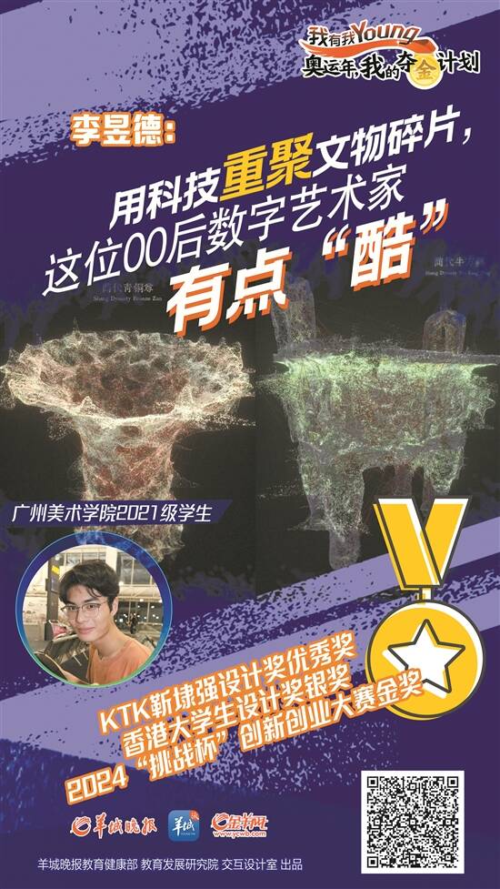 “我做这个项目的初衷,就是觉得‘这样做很酷!’”来自广州美术学院艺术与科技专业的21级学生李昱德给出了一个颇具00后跳脱风格的答案。今年,李昱德独立创作的多个以文物为蓝本的数字艺术作品在社交平台上赢得关注,接连被央视等媒体报道。新学期伊始,他带着对艺术的热爱与对传统文化的敬畏,规划着属于自己的“夺金计划”。