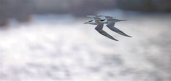 在位于温州市海域的南麂列岛国家级海洋自然保护区,波光粼粼的海面上空,两只凤头燕鸥前后紧挨着滑翔。它们同时转向,又几乎垂直向下短暂俯冲。随后它们调整姿态,向下绕圈滑行,至接近海平面时,它们再次同步滑行爬高,其后恢复振翅,缓缓飞回集群地。
