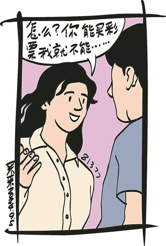 徐明惊讶地问夏梅:“你来买彩票?”夏梅一笑说:“怎么,你能买彩票我就不能买了?”徐明忙说:“不、不,我不是那个意思,我没想到你也喜欢彩票。”夏梅凑近低声说:“是啊,我不但喜欢买彩票,还想如果等哪天中了大奖,我就找个像你一样的帅哥当男朋友。”夏梅的话让徐明脸瞬间红了。