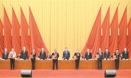 在欢快的乐曲声中,习近平等为受表彰的模范个人和模范集体代表颁奖。