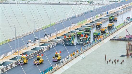 4日,经过1500名建设者的坚守奋战,黄茅海跨海通道高栏港大桥完成双幅环氧沥青铺装施工,并刷新了热拌环氧沥青铺装当日铺装最大里程数的世界纪录。
