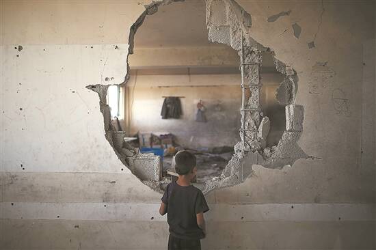 14日,在加沙地带中部努赛赖特难民营,一名儿童看着遭以军袭击的学校 新华社发