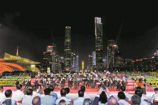 羊城晚报讯 记者黄宙辉、通讯员穗文广旅宣报道:珠江之畔,广州塔下,华章奏响。10月17日晚,2024年“湾区音乐汇”开幕式在广州塔精彩呈现。开幕音乐会由一级指挥、中国音协管乐学会主席、中国人民解放军军乐团原团长、音乐总监于海,率领阳光交响管乐团、粤港澳三地管乐团和合唱团近500人组成的演出队伍献演。