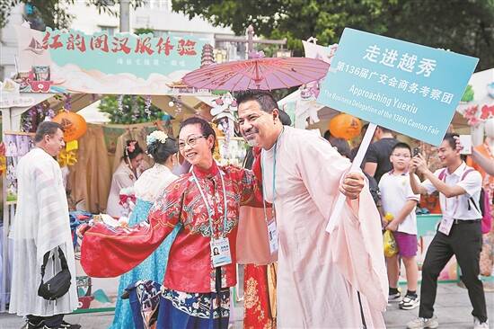 广州越秀五仙观,广交会商务考察团代表参观海丝文化节,境外客商体验汉服 羊城晚报记者 蔡嘉鸿 摄