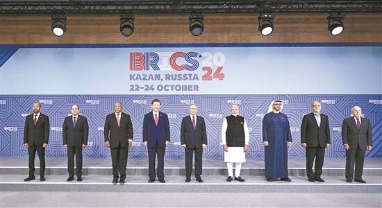 当地时间10月23日上午,金砖国家领导人第十六次会晤在喀山会展中心举行。俄罗斯总统普京主持会晤。中国国家主席习近平、巴西总统卢拉(线上)、埃及总统塞西、埃塞俄比亚总理阿比、印度总理莫迪、伊朗总统佩泽希齐扬、南非总统拉马福萨、阿联酋总统穆罕默德等出席。这是会晤期间,金砖国家领导人集体合影 新华社发