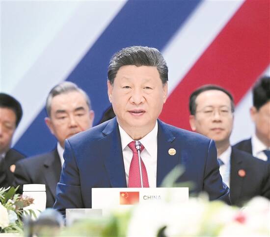 习近平强调,世界越是动荡,我们越要高举和平、发展、合作、共赢旗帜,淬炼金砖成色,展现金砖力量。要发出和平之声,倡导对话而不对抗、结伴而不结盟的新型安全。要共谋发展之路,倡导普惠包容的经济全球化,坚守共同发展的大道。要夯实合作之基,深化农业、能源、矿产、经贸等传统领域合作,拓展绿色低碳、人工智能等新兴领域合作,维护贸易投资和金融安全。
