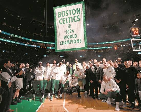 凯尔特人在主场波士顿北岸花园球场升起队史第18面总冠军旗帜