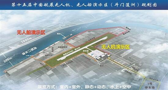为了顺应无人系统迅速发展的趋势,本届航展首次开辟中国航展第二展区,展示无人机、无人船等无人系统装备科技。第二展区所在的珠海莲洲通用机场和虎跳门水道的位置、条件得天独厚,既有900米跑道、停机坪、现有保障设施,也有宽350米左右、深约4.5米的航道。为了方便观众在这里观看表演,珠海市结合百年一遇防洪工程,专门修建了1公里的看台,并新建了展示码头,为无人机、无人船的展示提供充足的空间。