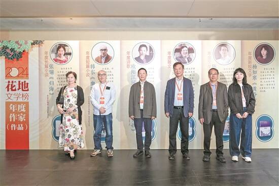 2024花地文学榜年度作家(作品)获得者合影留念(左起):张翎、韩东、欧阳江河、王尧、陈平原、杨知寒