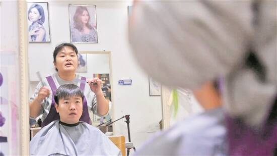 在湖南省怀化市的“靓点”理发店,理发师李静正给顾客理发