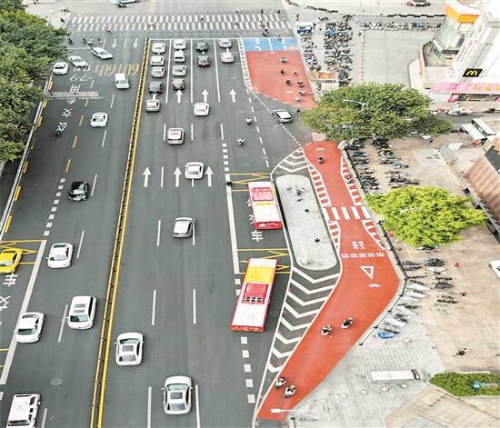 “针对公交站台区域的非机动车道,我们采取后绕式设置,即将非机动车道设置在公交站台的后方。”广州交警解释说,非机动车道采用红色涂料铺设,以醒目区分站台、非机动车道、人行道。交警部门还同步打通人行道路面的高低差,通过标线规范公交站台区域慢行系统通行条件,充分利用路口道路资源,避免了路口车辆违停违法行为的发生,有效提升路口的安全性。