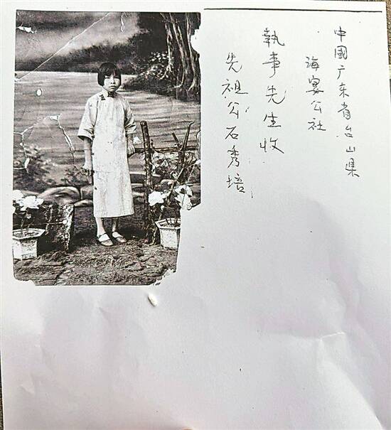 马小六向记者提供了复印件的照片,上面写着“中国广东省台山县海宴公社 执事先生收 先祖公石秀培”,在文字左侧,还附有那张身穿旗袍的女孩照片。西亚克斯称,父亲曾在中国育有一女,照片中的女孩或是自己同父异母的姐姐,“如果姐姐还活着,今年已是103岁了。”