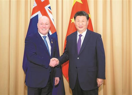 习近平指出,10年前,我访问新西兰,双方决定建立中新全面战略伙伴关系。10年来,中新关系保持健康稳定发展势头,有力增进了两国人民福祉,值得倍加珍惜。中新两国同为亚太地区重要成员,经济互补性、互惠性强,双方没有历史恩怨纠葛,没有根本利益冲突,应该把彼此视为机遇和伙伴,而不是挑战或威胁;应该冷静务实地管控分歧,而不是让分歧定义两国关系。中方愿同新方一道,继续发扬“争先”精神,共同打造相互尊重、彼此包容、聚焦合作、共同发展的中新关系,助力各自国家发展。