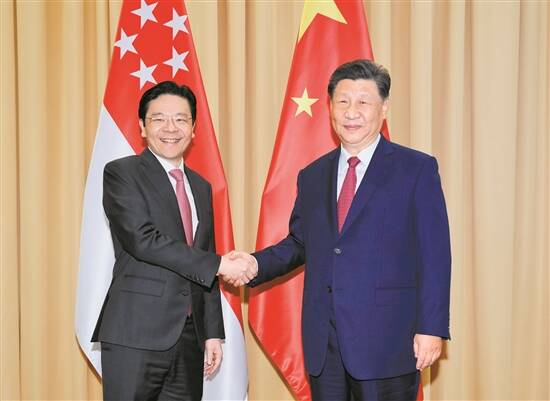 习近平强调,新加坡参与中国改革开放进程起步早、领域广、成果实。欢迎新方把握中国发展新机遇,继续建设好苏州工业园区、天津生态城、重庆示范性互联互通和广州知识城等合作项目,进一步打造数字经济、绿色发展、人工智能领域合作新增长点,不断扩大人文交流。面对世界百年变局,中方愿同新方加强在联合国、亚太经合组织等多边舞台上合作,共同倡导平等有序的世界多极化和普惠包容的经济全球化。