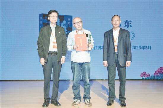 羊城晚报报业集团党委副书记、副社长、总编辑林海利(右)与广东省文联副秘书长梁少锋(左)共同为韩东颁发奖杯、证书及约稿函
