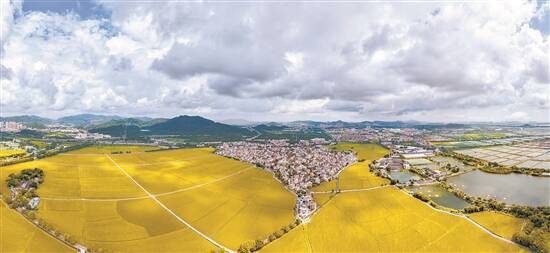 长烟碧空云岫,沃野千里金秋。羊城晚报《大美岭南》第103站走进中山市南朗街道崖口村。这里依山傍海,一草一木、一砖一瓦,皆凝聚着历史的厚重,微风轻拂,金穗摇曳起千层稻浪,一幅绝美的沃野鎏金画卷徐徐铺展。