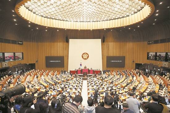 14日,在韩国首都首尔,韩国国会议员参加弹劾动议案投票 新华社发