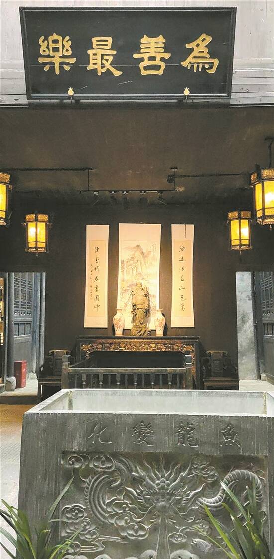 靠近古商城入口处,我们看到一栋开着八字门的古建筑,它始建于1644年,坐北朝南,为二进三层楼房,整个建筑布局别致,装饰精美。朋友介绍,这是古商城有名的苏州会馆。八为“发”,八字门就有“笑迎天下客,广纳八方财”的寓意。会馆是明清时期客迁商人建立的特殊社会组织,它在洪江商业发展中地位独特,曾行使过部分政府职能,但更多的,是为商人们提供会商洽谈的场所。鼎盛时期,洪江有18个省、80多个县在这里建成会馆。于是乎,“一个包袱一把伞,来到洪江当老板”风靡全国。我们走进会馆,看到墙上挂着“为善最乐”的牌匾。这里的商人们投身公益、集资捐款、抗战报国等义举曾赢得各方赞誉。