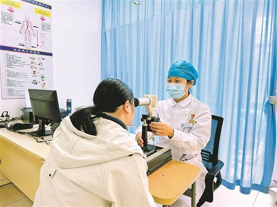 在广州市黄埔区夏岗街社区卫生服务中心,护士在用眼底检测仪为患者拍下眼底,随后由AI系统自动生成报告