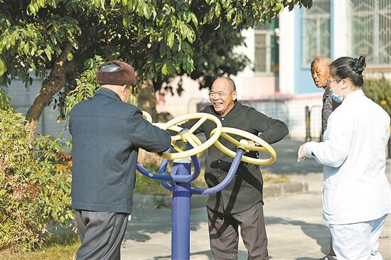 在丰顺县社会福利中心,护理员陪伴老人进行户外运动