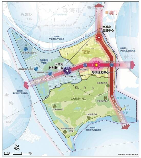 在空间格局上,《规划》明确了对接澳门北部城市功能、南部绿色休闲的整体空间结构,塑造合作区“北城南野、差异共生”的国土空间整体格局;围绕十字轴带(琴澳一河两岸合作轴带、天沐河城市中心发展轴带),三大片区(琴澳活力核心区、创新智造产城区、生态健康休闲区),三大中心(琴澳活力中心、金融岛金融中心、天沐河科创新中心),构建“十字轴带、三大片区、三心多点”的空间结构。