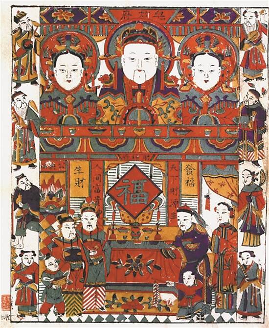 清代山东潍县的灶君图。画面中间的是灶神和他的一对妻妾,两边是“八仙”,下边是屋主一家迎接怀抱元宝的财神