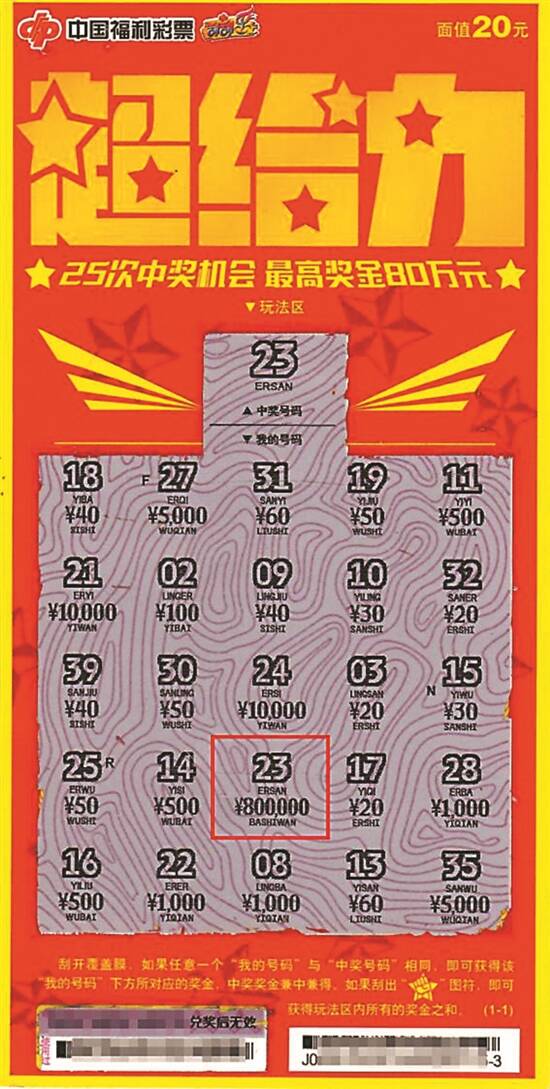兑奖现场,李先生分享了中奖经过。那天晚上,他到44122480福彩销售站点购买双色球和刮刮乐。销售人员拿出一本“超给力”(面值20元),他购买了7张开刮,有两张幸运刮出了20元,在刮开最后一张彩票时,在票面“我的号码”区域刮出了“中奖号码”23,细看下方对应的中奖奖金竟然是“¥800000”。