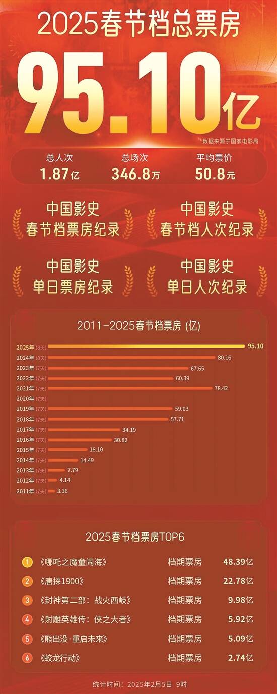 2019年暑期档,该系列首部《哪吒之魔童降世》以中国影史第二的观影人次,成为家喻户晓的国民超级大片。该片收获票房50.75亿元,让非动画专业出身的导演兼编剧饺子闻名业界。时隔6年,饺子打造出了续作《哪吒之魔童闹海》,直接进军全年竞争最激烈的春节档,同样大获全胜。截至2月5日16时,《哪吒之魔童闹海》预测总票房已高达87.38亿元,超越总票房57.75亿元的《长津湖》成为中国影史票房第一名已无悬念。