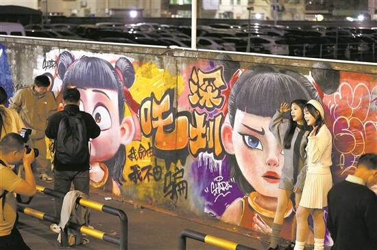 羊城晚报讯 记者王磊摄影报道:13日,春节档动画电影《哪吒之魔童闹海》持续火爆,票房成功突破100亿元大关。随着影片爆火,“哪吒热”持续高涨,不仅席卷各大影院,还蔓延到城市街道。在深圳民治街道上芬社区,一面哪吒主题涂鸦墙随着电影热映成为热门打卡点。13日20时,许多市民在得知电影破百亿元的消息后专程赶来拍照打卡,现场热闹非凡。