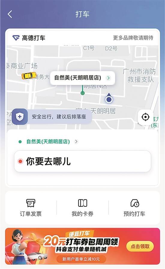 点击进入后可以发现,当前抖音打车服务主要通过另一聚合平台高德打车来提供服务。有意思的是,虽然当前只有高德打车接入,但页面也显示着“更多品牌敬请期待”。羊城晚报记者在同一时间段的同样一段路(以羊城晚报所在的羊城创意产业园至天河公园地铁站)进行打车测试发现,抖音打车略高于高德打车的价格(由于第一次使用,有相关优惠券可用),而较滴滴打车要更便宜几元。